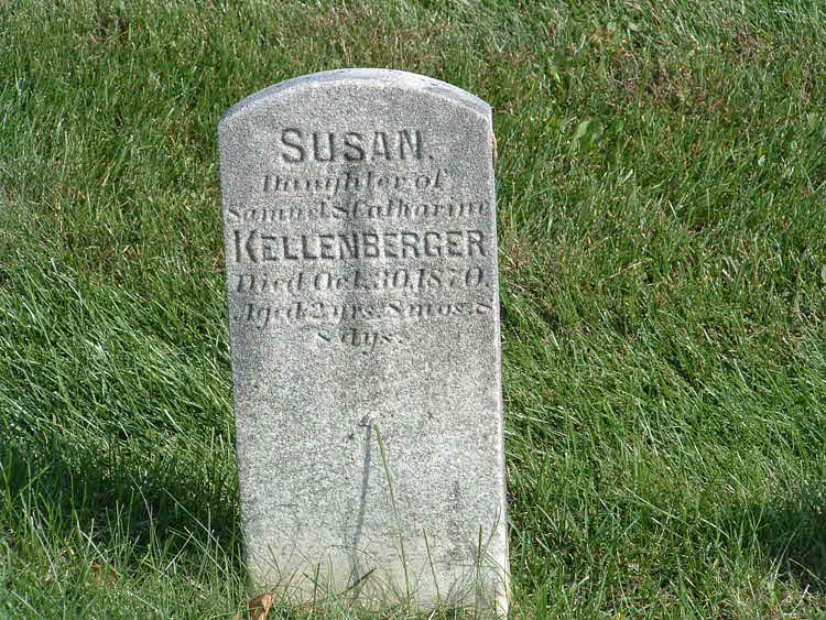 Susan Kellenberger was born on 22 February 1868 at Lancaster, Pennsylvania.1 She died on 30 October 1870 at Lancaster, Pennsylvania, at age 2.1 She was buried on 3 November 1870 at Weavertown Amish-Mennonite Cemetery, Weavertown, Lancaster, Pennsylvania.1 Susan Kellenberger Find-a-Grave.com ID # 35851746.
