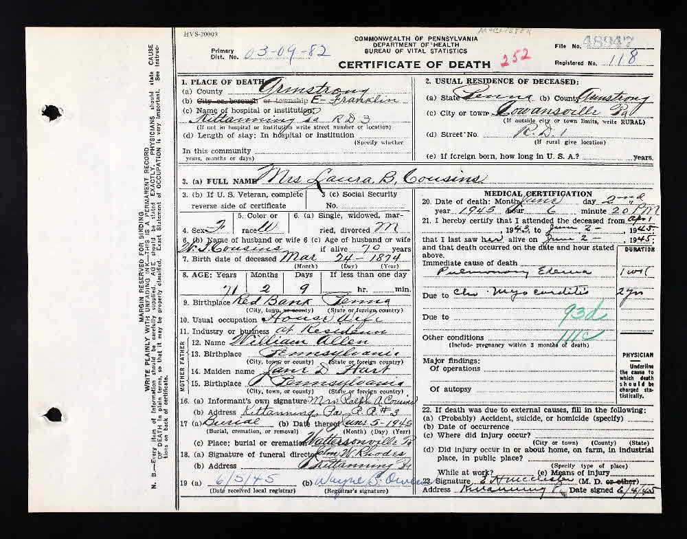 - [S32] Death Certificate, Pennsylvania Death Certificates 1906-1963. Certificate # 48947 for daughter Laura B Cousins.