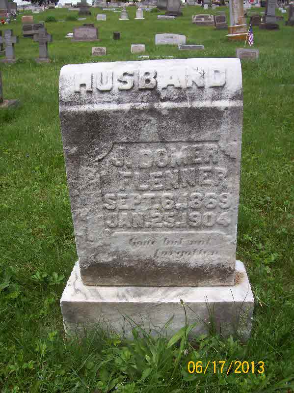 Jacob Domer Flenner was born on 6 September 1869 at Armstrong, Pennsylvania.1,2 He married Clara Brison on 3 April 1895.3,4,5 Jacob Domer Flenner died on 25 January 1904 at age 34.3 He was buried on 30 January 1904 at Prospect Cemetery, Brackenridge, Allegheny, Pennsylvania.3 Jacob Domer Flenner Find-a-Grave.com ID # 42827331.