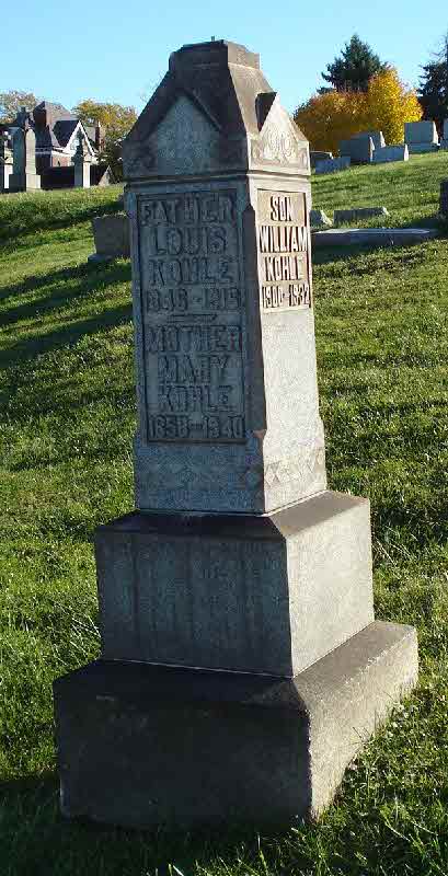 Louis Joseph Kohle married Rose G Hertrich.2 Louis Joseph Kohle was born on 31 October 1882 at Pittsburgh, Allegheny, Pennsylvania.1,2 He died on 7 October 1917 at Pittsburgh, Allegheny, Pennsylvania, at age 34.2 He was buried on 10 October 1917 at Saint Michaels Cemetery, Mount Oliver, Allegheny, Pennsylvania.2 Louis Joseph Kohle Find-a-Grave.com ID # 137821023 + family links.