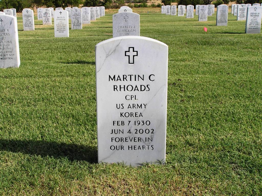 Martin C Rhoads was born on 7 February 1930.1,2 He died on 4 June 2002 at Oklahoma at age 72.3,2 He was buried on 7 June 2002 at Fort Sill National Cemetery, Elgin, Comanche, Oklahoma.2 Martin C Rhoads Find-a-Grave.com ID # 18297728.