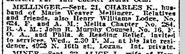 Charles Kaufman Mellinger was born on 19 January 1873 at Pennsylvania.1 He married Marie Weaver, daughter of George H Weaver and Sarah A Kelly, in 1894 at Philadelphia, Pennsylvania.1 Charles Kaufman Mellinger died on 21 September 1918 at Philadelphia, Pennsylvania, at age 45.1 He was buried on 24 September 1918 at Hillside Cemetery, Roslyn, Montgomery, Pennsylvania. Lot 730, Section A, in corner by section D and Susquehanna Road.2 Charles Kaufman Mellinger Find-a-Grave.com ID # 113646762.
