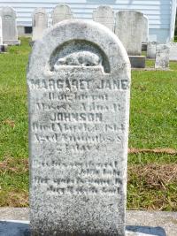 Margaret Jane Johnson was born on 11 February 1860.1 She died on 5 March 1864 at Lancaster, Pennsylvania, at age 4.1 She was buried on 8 March 1864 at Georgetown United Methodist Cemetery, Georgetown (Bart), Lancaster, Pennsylvania.1 Margaret Jane Johnson Find-a-Grave.com ID # 84370207.