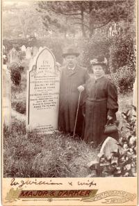 William J Williams and his wife Mary Ann Ritallick standing with stone they erected for his father in Camborne, United Kingdom.