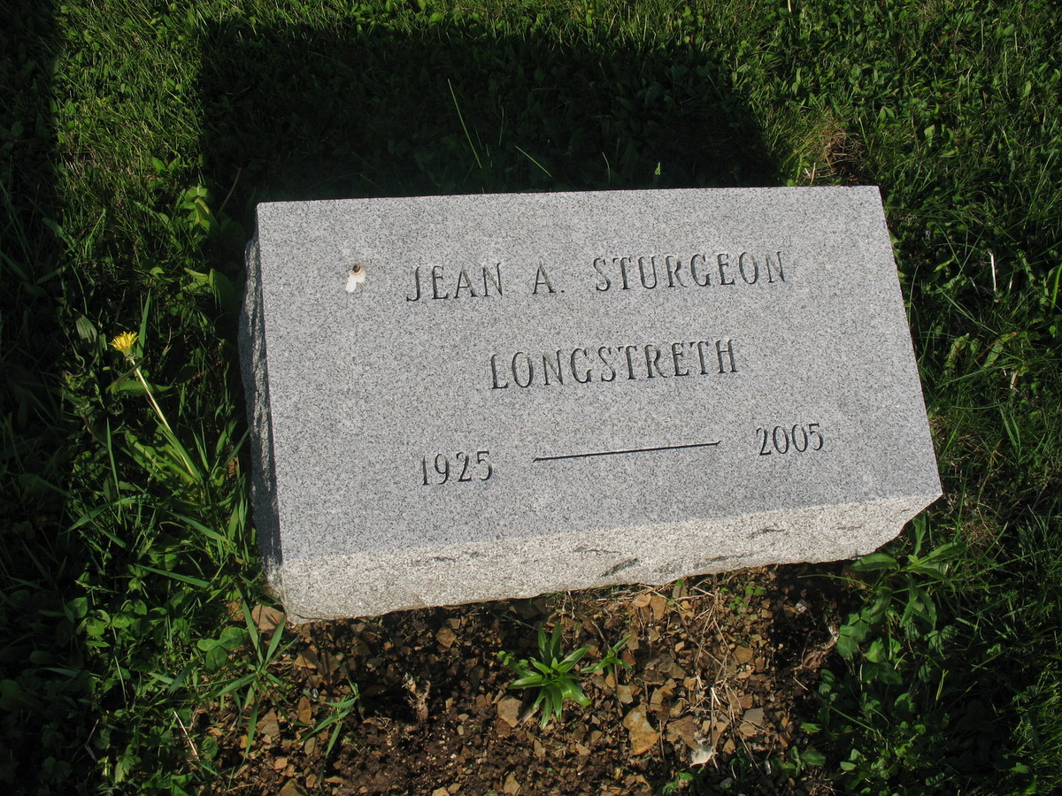 Jean Alice Sturgeon was born on 17 September 1925 at Crafton, Pennsylvania.1,3 She was baptized on 17 October 1926 at Carnegie, Pennsylvania.3 She married Peter Winebrenner Longstreth Jr, son of Peter Winebrenner Longstreth Sr and Mary A Wallace, on 16 June 1951 at Oakdale, Pennsylvania.1,3 Jean Alice Longstreth died on 11 July 2005 at Oakdale, Allegheny, Pennsylvania, at age 79.1 She was buried on 14 July 2005 at Robinson Run Cemetery, McDonald, Allegheny, Pennsylvania.1 Jean Alice Sturgeon Find-a-Grave.com ID # 109854926.