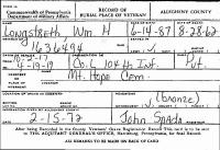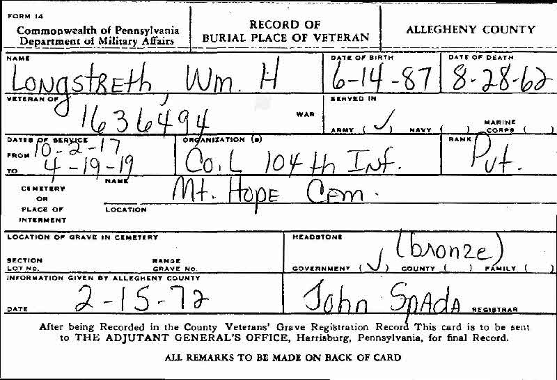 William Huston Longstreth was born on 14 June 1887 at Newsmanstown, Pennsylvania.2 He was buried on 28 August 1962 at Mt Hope Cemetery, Pittsburgh, Allegheny, Pennsylvania.2 He died on 28 August 1962 at VA Hospital, Butler, Butler, Pennsylvania, at age 75.Cause of death was Uremia.2