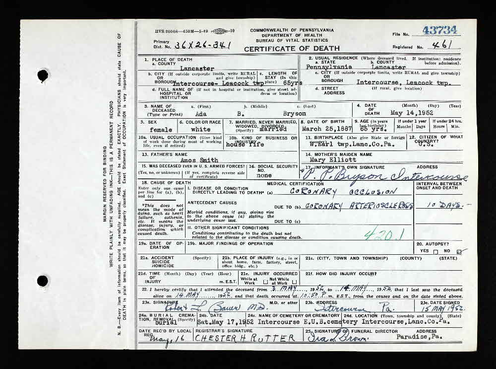 ? Her married name was Bryson.1 She lived before 18 February 1958 at Gordonville, Lancaster, Pennsylvania. Lived here for 20 years prior to her death.4