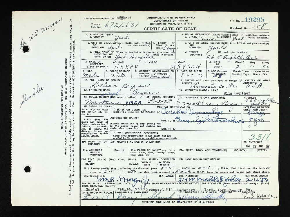 Harry Bryson was born on 27 September 1897 at Lancaster, Pennsylvania.1 He married Lillian I (?) circa 1930.2 Harry Bryson died on 11 February 1956 at York Hospital, York, York, Pennsylvania, at age 58. Cause of death was cerebral hemorrage.1 He was buried on 14 February 1956 at Prospect Hill Cemetery, York, York, Pennsylvania.1 Harry Bryson Find-a-Grave.com ID # 97670837-No tombstone photo as of March 22, 2015.