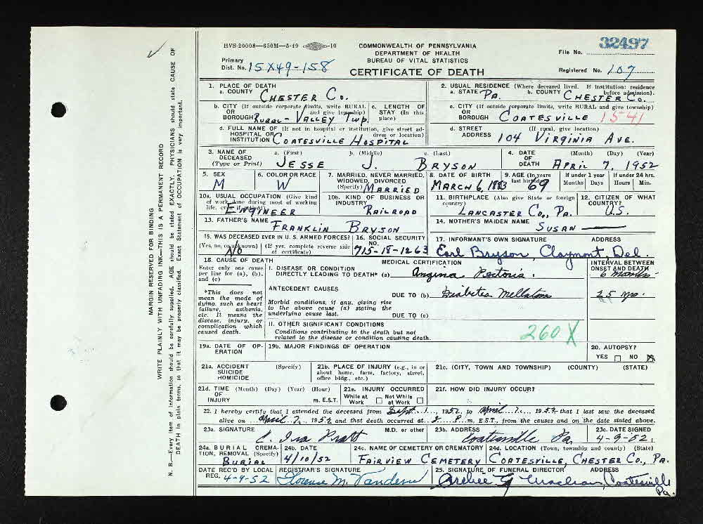 - [S32] Death Certificate, Pennsylvania, Death Certificates, 1906-1963 # 15760.