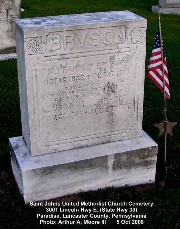 ? M Franklin Bryson was also known as Frank Bryson.3 He was listed as a resident in Richard Bryson and Rachel Bryson's household in the census report in 1850 at BartTownship, Lancaster, Pennsylvania. His name is William F on this census.4 M Franklin Bryson was listed as a resident in Richard Bryson and Rachel Bryson's household in the census report in 1860 at Quarryville, Lancaster, Pennsylvania; Also recorded in this household was a young boy, age 2, Francis Bushong. Other neighbors were Bushongs. This census page was mixed up, children are recorded on page 406 of census.5 M Franklin Bryson began military service on 15 January 1863 Served with Co F, 21st PA Calvary.6 He ended military service on 8 July 1865, served 1 yr, 5 mon, 24 days.6 He was a stone mason in 1880 at Paradise, Lancaster, Pennsylvania.7 He and Susan Bryson appeared on the census of 7 June 1880 at Paradise, Lancaster, Pennsylvania.7 M Franklin Bryson appeared on the census of 1890 at Paradise, Lancaster, Pennsylvania.8