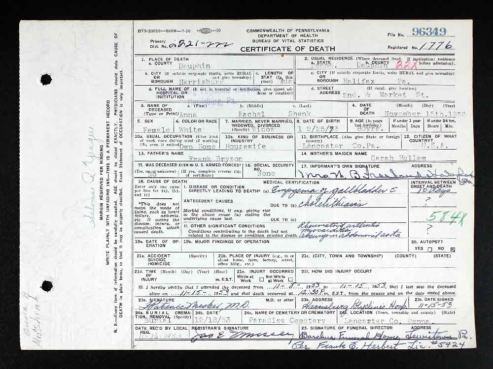 - [S32] Death Certificate, Pennsylvania Death Certificates 1906-1963. Certificate #96349 for wife Anna Rachel Bryson Shenk.