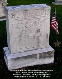 William Bryson was born in 1812 at Lancaster, Pennsylvania.2,3 He married Elizabeth Harsh before 1851.1 William Bryson died on 9 October 1897.3 He was buried on 12 October 1897 at Trinty Lutheran Cemetery, New Holland, Lancaster, Pennsylvania.3 William Bryson Find-a-Grave.com ID # 84634665.