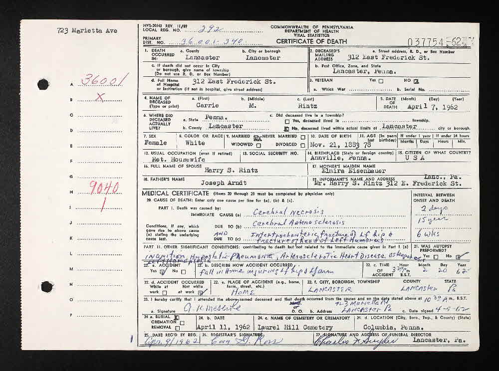 Carrie M Arndt was born on 21 November 1883 at Annville, Pennsylvania.1 She married Harry S. Rintz, son of David Alexander Rintz and Clara Ruth, on 2 February 1933.1,3 Carrie M Rintz died on 7 April 1962 at 312 E Frederick St, Lancaster, Lancaster, Pennsylvania, at age 78. Cause of death was cerebral necrosis due to fall in home, broken hip, cerebral arteriosclerosis.1 She was buried on 11 April 1962 at Laurel Hill Cemetery, Columbia, Lancaster, Pennsylvania.1 Carrie M Rintz Find-a-Grave.com ID # 163585899.