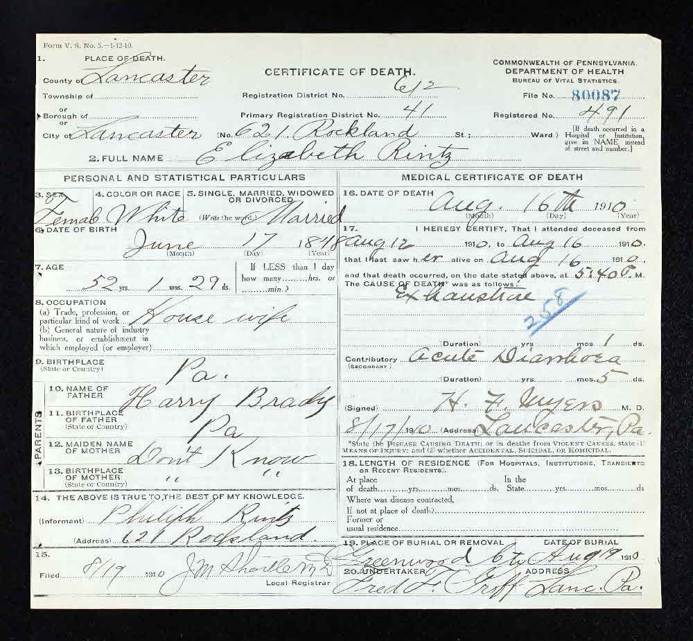 Elizabeth Brady was born on 17 June 1845 at Pennsylvania.1,3 She married Phillip Rintz, son of John Rintz and Barbara Burgess, circa 1877.1 Elizabeth Brady died on 16 August 1910 at 621 Rockland St, Lancaster, Lancaster, Pennsylvania, at age 65. Cause of death was exhaustion caused by acute diarrhea.1,3 She was buried on 19 August 1910 at Greenwood Cemetery, Lancaster, Lancaster, Pennsylvania.1 Elizabeth Brady Find-a-Grave.com ID # 87382820.