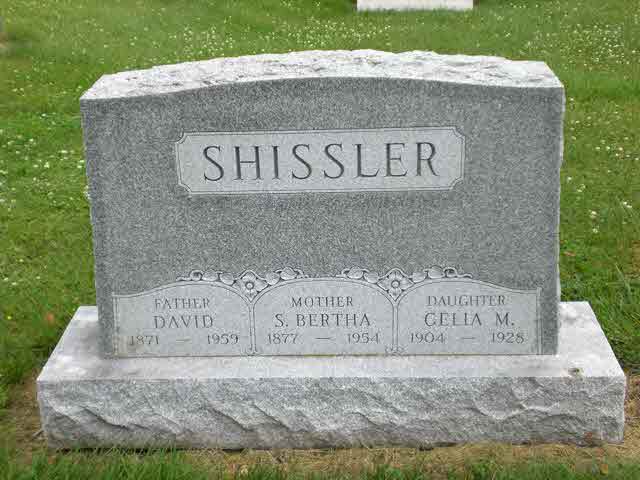 David Shissler was born in 1871.1 He married Bertha Bryson, daughter of M Franklin Bryson and Susan Helm, circa 1901.1 David Shissler died in 1959.1 He was buried in 1959 at Saint Johns United Methodist Cemetery, Paradise, Lancaster, Pennsylvania.1 David Shissler Find-a-Grave.com ID # 53040078 + family links.