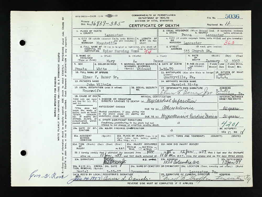 Mary A Wilhelm was born on 16 March 1879 at Quarryville, Lancaster, Pennsylvania.1 She married Elmer F Bauer Sr circa 1900.2,3 Mary A Bauer died on 13 January 1957 at Epler Nursing Home, Mountville, Lancaster, Pennsylvania, at age 77. Cause of death was myocardial infarction due to hypertensive cardiac disease. Funeral Director was Fred F. Groff.1 She was buried on 15 January 1957 at Greenwood Cemetery, Lancaster, Lancaster, Pennsylvania.1 Mary A Wilhelm Find-a-Grave.com ID # 99017152.
