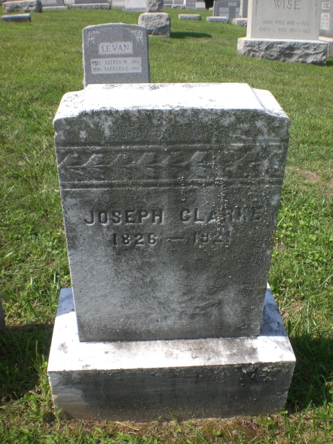 Joseph Clark was born on 2 January 1826 at Pennsylvania.1 He married Anna M Williams, daughter of George Williams and Esther Patton, circa 1850.2,3 Joseph Clark died on 12 March 1921 at Gap, Lancaster, Pennsylvania, at age 95. Joseph Clarke, one of oldest residents of Salisbury township, died at his home near Gap, Saturday as 12 o'clock. He was 95 years of age. Mr Clarke had been a staunch Republican all his life and a member of the Freemont-Lincoln Club. He is survived by six children. HIs wife died a few years ago. The funeral will be held from his late home, Tuesday at 2 o'clock. Interment will be stricly private.4 He was buried on 15 March 1921 at Bellvue Cemetery, Gap, Lancaster, Pennsylvania. Cause of death was chronic bronchitis.4 Joseph Clark Find-a-Grave.com ID # 77569743.