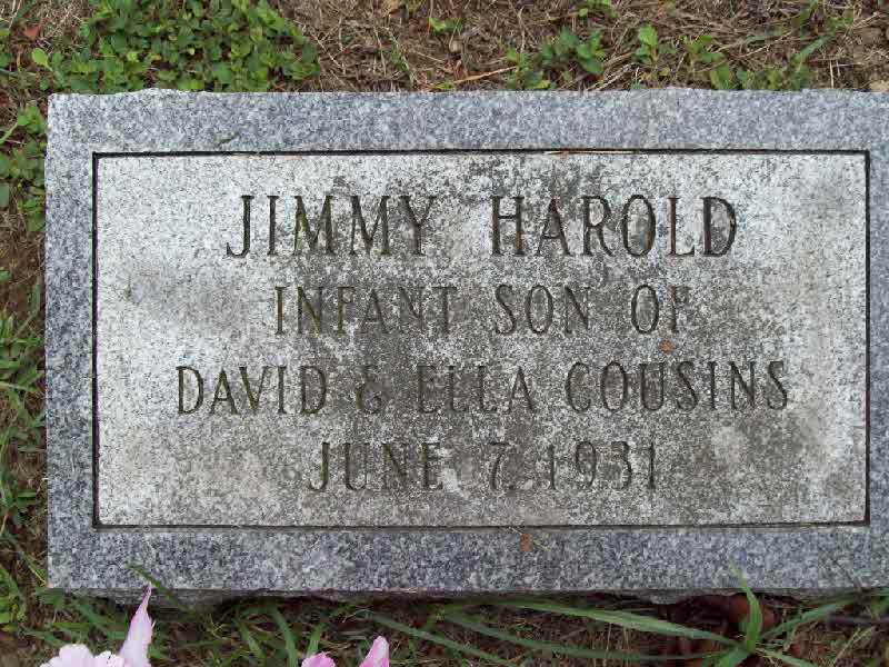 James Harold Cousins was born on 7 June 1931 at North Buffalo Township, Armstrong, Pennsylvania.2,3 He died on 7 June 1931 at North Buffalo Township, Armstrong, Pennsylvania. Cause of death was premature.1,3 He was buried on 10 July 1931 at Grace Brethren Church Cemetery, Center Hill, Armstrong, Pennsylvania.1 James Harold Cousins Find-a-Grave.com ID # 41983123.