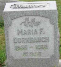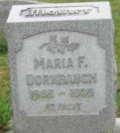 Maria F Heisler was born on 15 March 1856 at Lancaster, Pennsylvania.1 She married George G Dornbaugh before 1890.2 Maria F Heisler died on 5 October 1938 at 427 N. Cherry St, Lancaster, Lancaster, Pennsylvania, at age 82. Cause of death was cerebral hemorrhage. Funeral director was Fred Groff, Lancaster, PA.1 She was buried on 7 October 1938 at Greenwood Cemetery, Lancaster, Lancaster, Pennsylvania.1 Maria F Heisler Find-a-Grave.com ID # 96616109.