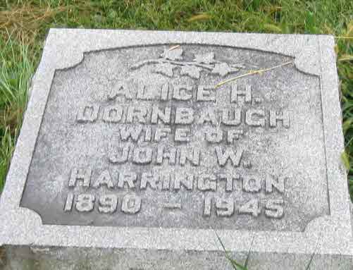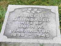 Alice H Dornbaugh married John W Harrington.1 Alice H Dornbaugh was born in 1890.1 She was buried in 1945 at Greenwood Cemetery, Lancaster, Lancaster, Pennsylvania.1 She died in 1945.1 Alice H Dornbaugh Find-a-Grave.com ID # 96616439.