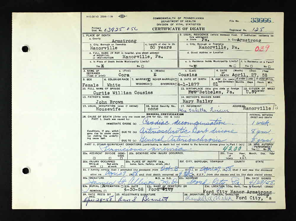 - [S32] Death Certificate, Pennsylvania Death Certificates 1906-1963. Certificate # 33666 for daughter Cora Cousins.