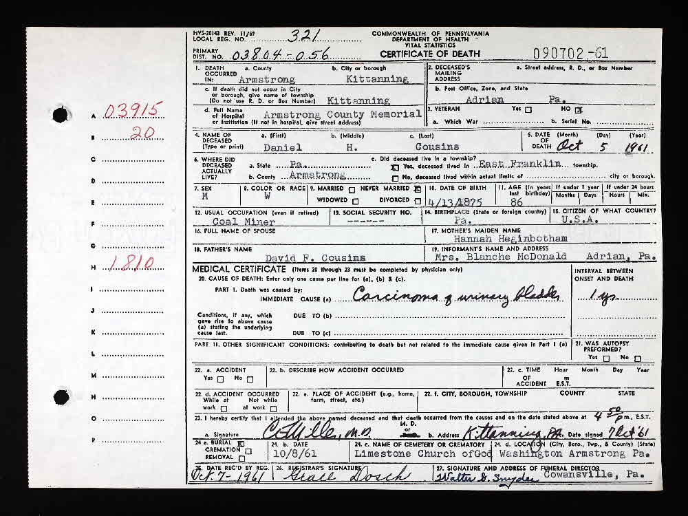 Daniel Henry Cousins was born on 13 April 1875 at Bradys Bend, Armstrong, Pennsylvania.1,3 He died on 5 October 1961 at Armstrong County Memorial, Kittanning, Armstrong, Pennsylvania, at age 86. Cause of death cancer of urinary bladder. Death certifcate states he was never married.1 He was buried on 8 October 1961 at Limestone Church of God Cemetery, Washington, Armstrong, Pennsylvania.1 Daniel Henry Cousins Find-a-Grave.com ID # 141913717.