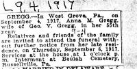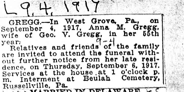 ? As of 29 September 1885,her married name was Gregg. She witnessed the death of Burrows Vandegrift on 2 July 1911 at Oxford, Chester, Pennsylvania; Cause of death was general senile.5 Anna Mary Vandegrift lived in September 1917 at 132 Summit Ave, West Grove, Chester, Pennsylvania.6 She was ill with Cancer of uterus in September 1917.7