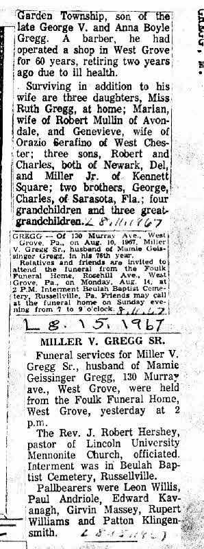 ? He lived on 6 September 1917 at 130 Murray Ave, West Grove, Chester, Pennsylvania. He was a barber in a barbershop on 19 January 1920.6 He and Mamie Edna Gregg appeared on the census of 19 January 1920 at 151 Edge Hill Avenue, West Grove, Chester, Pennsylvania. Miller Vandegrift Gregg was self-employed on 27 April 1942 at 130 Murray St, West Grove, Chester, Pennsylvania.7 He was described as 6 ft tall, weighing 150 lbs, gray eyes, gray hair, light complexion, with a scar on left knee. on 27 April 1942.7 He lived on 27 April 1942 at 130 Murray St, West Grove, Chester, Pennsylvania.7 He ended military service on 27 April 1942 at Kennet Square, Chester, Pennsylvania.2 He and Mamie Edna Geissinger were (an unknown value) on 30 April 1944 at West Grove, Chester, Pennsylvania.8 His Social Security Number was # 175-28-2036 on 2 January 1952.1 Miller Vandegrift Gregg was ill with Terminal Heart Failure cause of death on 8 August 1967 at West Grove, Chester, Pennsylvania.