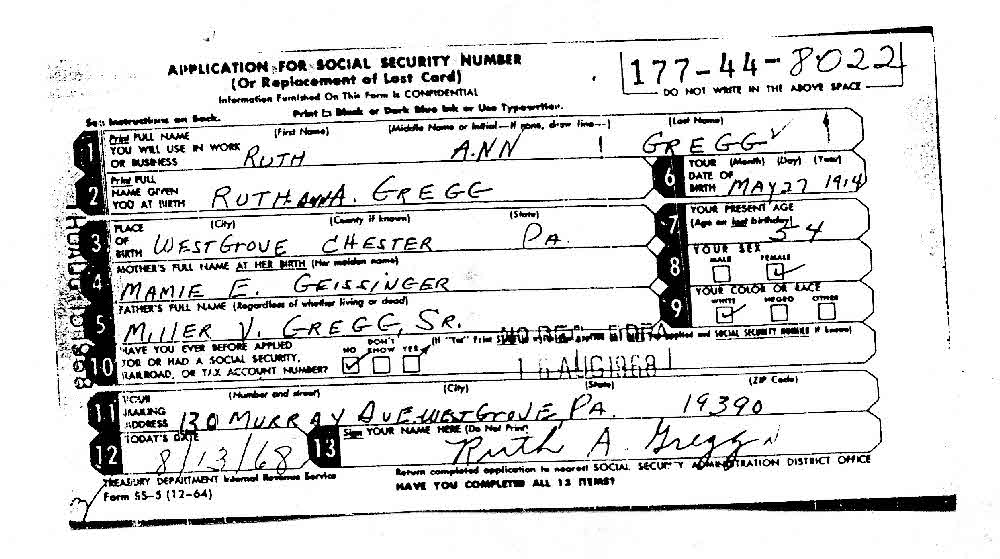 ? She appeared on the census of 19 January 1920 at 151 Edge Hill Avenue, West Grove, Chester, Pennsylvania. She was a witness when Miller Vandegrift Gregg and Mamie Edna Geissinger were (an unknown value) on 30 April 1944 at West Grove, Chester, Pennsylvania.6 Ruth Anna Gregg lived on 13 August 1968 at 130 Murray Ave, West Grove, Chester, Pennsylvania.7 Her Social Security Number was # 177-44-8022 on 13 August 1968.7 She lived in 1969 at Norristown, Pennsylvania. She was ill with cause of death Cardio-pulmonary arrest, fever of unknown origin and arteriosclerotic heart disease. Also peripheral Vascular disease, Schizophrenia, Alzheimers disease, Advanced dementia. on 7 December 1996.4 She lived on 7 December 1996 at Conestoga View, Lancaster, Lancaster, Pennsylvania.8