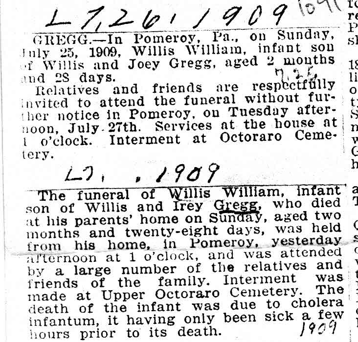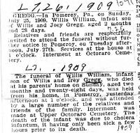 Willis William Gregg was born on 28 April 1909 at Chester, Pennsylvania.1,2 He died on 25 July 1909 at Sadsbury Township, Chester, Pennsylvania.1,2 He was buried on 27 July 1909 at Upper Octoraro Cemetery, Parkesburg, Chester, Pennsylvania.1