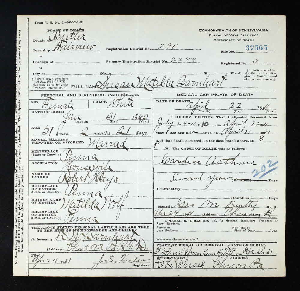 ? He witnessed the death of Susan Matilda Hays on 22 April 1911 at Fairview Township, Butler, Pennsylvania; Cause of death was cardiac asthma.2