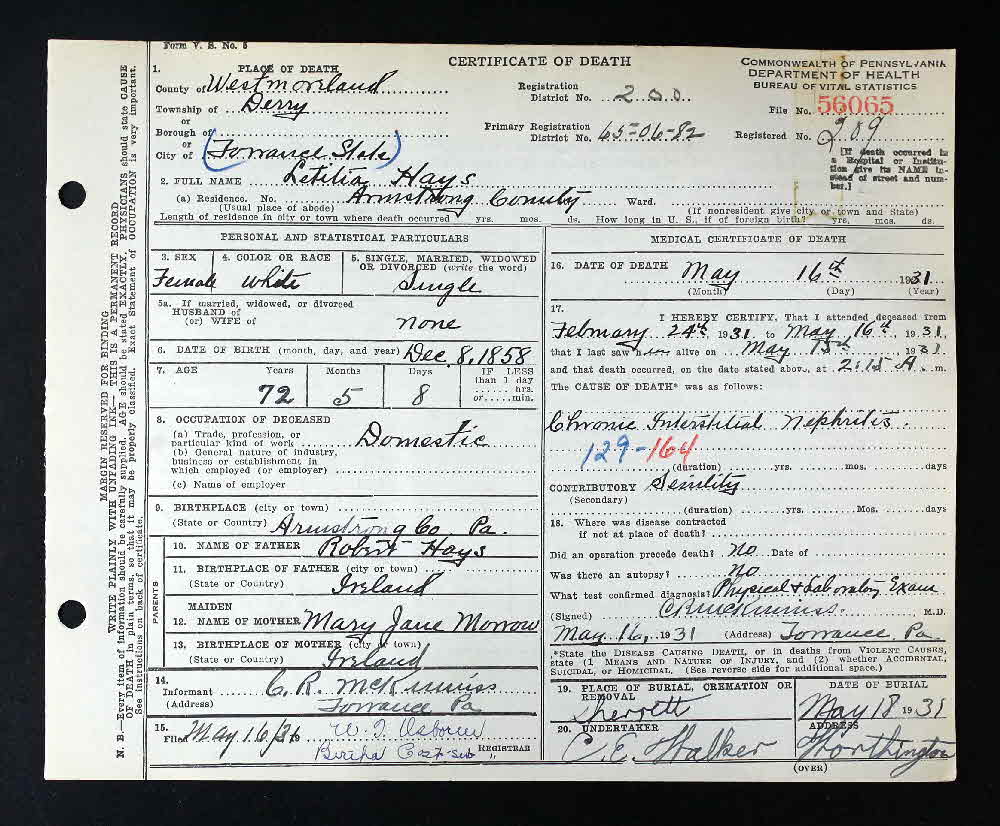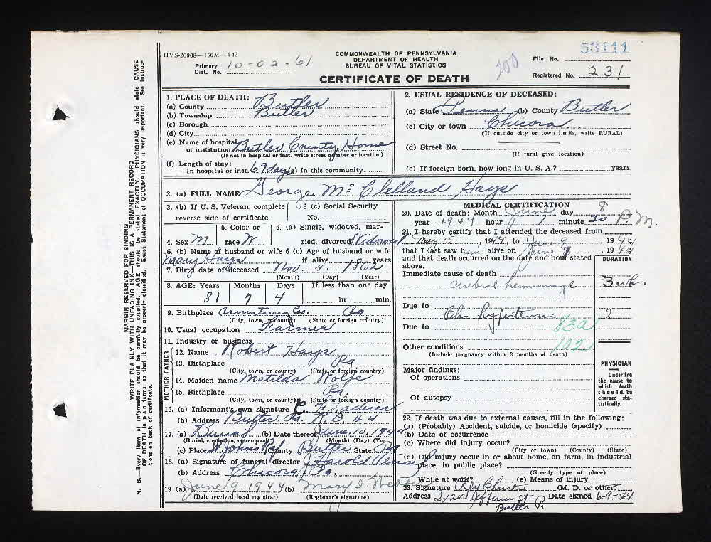 - [S32] Death Certificate, Pennsylvania Death Certificates 1906-1963. Certificate # 53111 for husband George McClelland Hays.