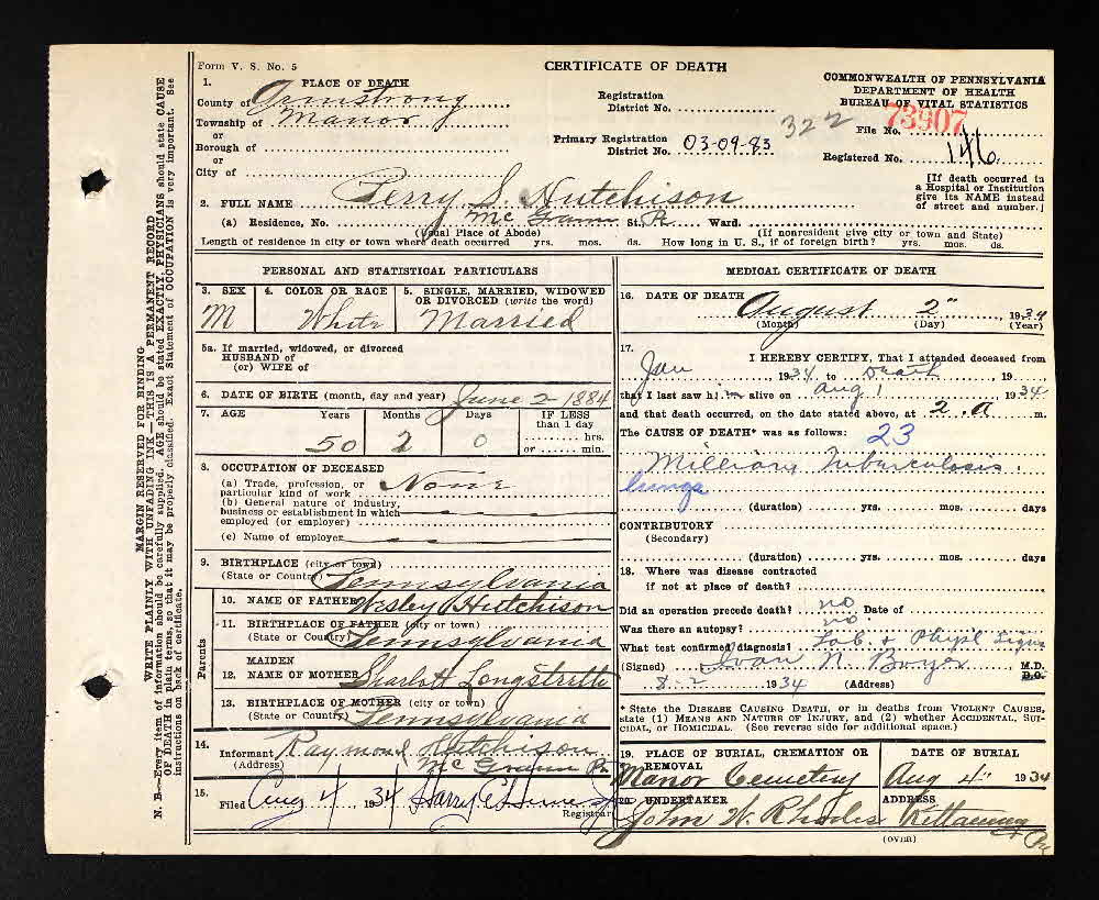 - [S32] Death Certificate, Pennsylvania Death Certificates 1906-1963. Certificate # 27315.