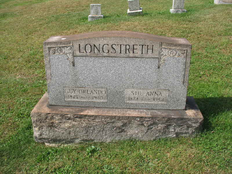 Guy Orlando Longstreth was born on 24 November 1873 at Armstorng, Pennsylvania.1 He married Sue Anna Shriner in 1898.4,2 Guy Orlando Longstreth died on 22 March 1940 at Conemaugh Valley Memorial Hospital, Johnstown, Cambria, Pennsylvania, at age 66. Cause of deat was peritonitis following operation for large ulcer malignant.1 He was buried on 25 March 1940 at Benshoff Hill Cemetery, Johnstown, Cambria, Pennsylvania.1 Guy Orlando Longstreth Find-a-Grave.com ID # 63723825 + full obituary and family links.
