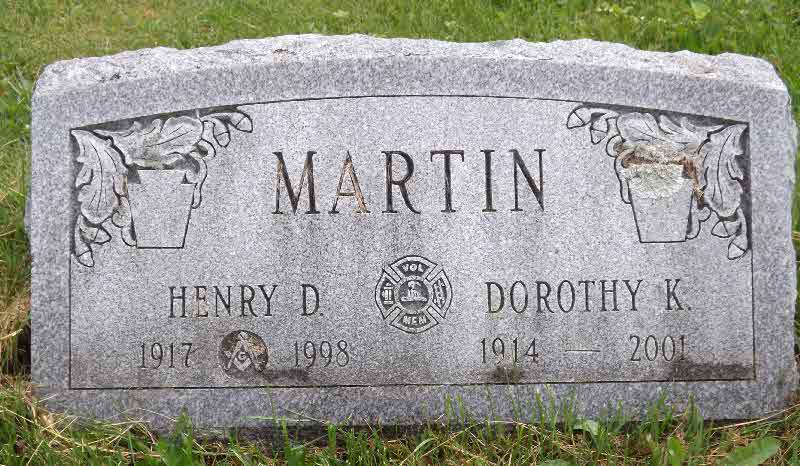Henry D Martin was born on 5 February 1917 at Lancaster, Pennsylvania.2 He married Dorothy K Rineer, daughter of Guy Harrison Rineer and Mary Grace Haubert.1 Henry D Martin died on 9 June 1998 at Lancaster, Lancaster, Pennsylvania, at age 81.2 He was buried on 12 June 1998 at Quarryville Cemetery, Quarryville, Lancaster, Pennsylvania.2 Henry D Martin Find-a-Grave.com ID # 111043475 + family links.