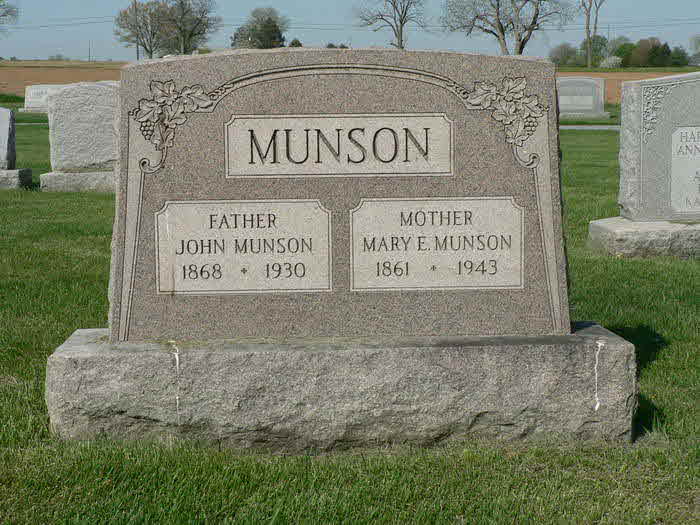 John Munson was born on 17 September 1868 at Lancaster, Pennsylvania.1,2 He married Mary Elizabeth Yunginger, daughter of John Yunginger and Dorothy Gebhardt, before 1896.1 John Munson died on 1 April 1930 at Strasburg Township, Lancaster, Pennsylvania, at age 61. Cause of death was liver cancer.2,3 He was buried on 4 April 1930 at Longeneckers Reformed Mennonite Cemetery, Lancaster, Lancaster, Pennsylvania.2,3 John Munson Find-a-Grave.com ID # 35107432.