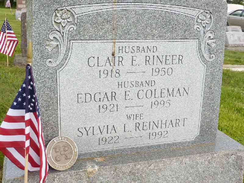 Clair E Rineer was born on 29 October 1918 at Lancaster, Pennsylvania.1,2 He married Sylvia L Reinhart after 1925.3 Clair E Rineer died on 13 June 1950 at Lancaster General Hospital, Lancaster, Lancaster, Pennsylvania, at age 31. Cause of death was uremia and pulmonary adema.1,2 He was buried on 16 June 1950 at Middle Octorara Cemetery, Quarryville, Lancaster, Pennsylvania.2,3 Clair E Rineer Find-a-Grave.com ID # 32455970.