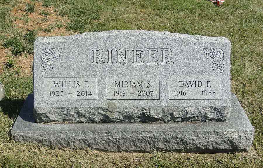 Willis Fred Rineer was born on 15 August 1927 at Green Tree, Bart Township, Lancaster, Pennsylvania.1,2 He married Miriam S McComsey, daughter of Sides McComsey and Susanna Stoner, before 2007.3 Willis Fred Rineer died on 4 September 2014 at Mennonite Home, Lancaster, Lancaster, Pennsylvania, at age 87.1 He was buried on 7 September 2014 at Middle Octorara Cemetery, Quarryville, Lancaster, Pennsylvania.3 Willis Fred Rineer Find-a-Grave.com ID # 135504688 + obit.