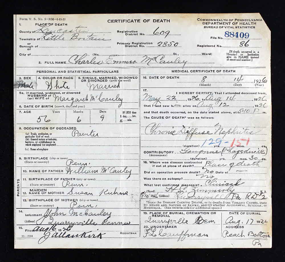 - [S32] Death Certificate, Pennsylvania Death Certificates 1906-1963 @ Ancestry.com #88409 for husband Charles McCauley.