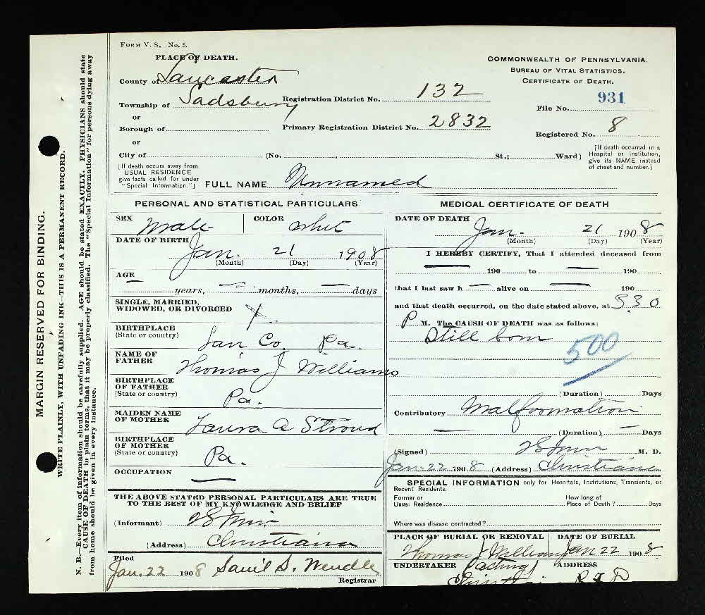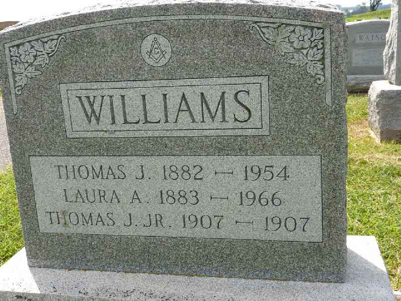 Thomas James Williams Jr was buried on 21 January 1907. Birth & death dates on death certif is 1908.1 He was born on 21 January 1907 at Sadsbury Township, Lancaster, Pennsylvania, Birth & death dates on death certif is 1908.1,2 He died on 21 January 1907 at Sadsbury Township, Lancaster, Pennsylvania.1 Thomas James Williams Jr Find-a-Grave.com ID # 97788037.