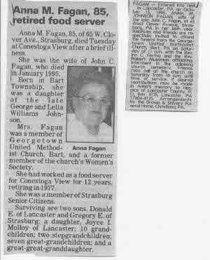 Anna M Johnson was born on 16 December 1910 at Bart Twp, Lancaster, Pennsylvania.1 She married John C Fagan on 21 December 1929 at Elverson, Pennsylvania. Anna M Johnson died on 15 October 1996 at Conestoga View, Lancaster, Pennsylvania, at age 85.1 She was buried on 18 October 1996 at Georgetown Methodist Cemetery, Bart, Lancaster, Pennsylvania.2 Anna M Johnson Find-a-Grave.com ID # 84273475.