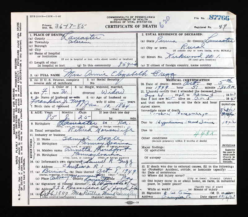 - [S126] Find-a-Grave.com Obituary, Various, Find a Grave, database and images (https://www.findagrave.com/memorial/21482876/… accessed 20 October 2021), memorial page for Annie Elizabeth Bogle Gregg (10 Jan 1864–5 Oct 1949), Find a Grave Memorial ID 21482876, citing Calvary Monument Bible Church Cemetery, Paradise, Lancaster County, Pennsylvania, USA; Maintained by Carolyn Y Lowe Shifflett (contributor 46796232).