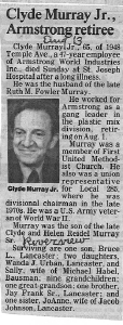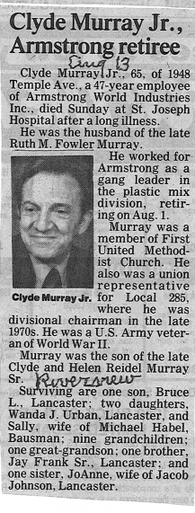 Clyde A Murray Jr married Ruth Fowler. Clyde A Murray Jr died on 13 August 1989 at St Joseph Hospital, Lancaster, Lancaster, Pennsylvania.1 He was buried on 16 August 1989 at Riverview Cemetery, Lancaster, Lancaster, Pennsylvania.1