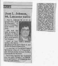 Joan L Murray was born in 1930 at Lancaster, Pennsylvania. She married Jacob H Johnson in August 1950 at Lancaster, Pennsylvania. Joan L Murray died on 10 January 1996 at home. She was buried on 13 January 1996 at Millersville Mennonite Cemetery, Millersville, Lancaster, Pennsylvania. Joan L Johnson Find-a-Grave.com ID # 61161119.