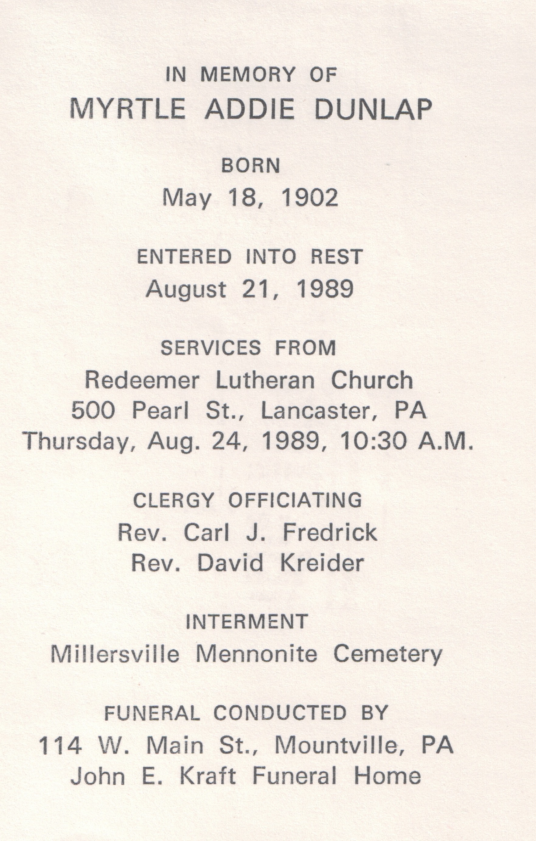 - [S67] Various Newspapers, Lancaster Newspapers, Aug 23 1989 for Myrtle Dunlap.