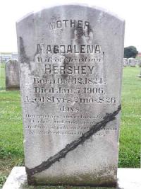 Hershey - On the 7th of Jan., 1906, in Paradise Twp., Lancaster Co., Pa., of the infirmities of old age, Magdalena Hershey, widow of Christian Hershey, in her eighty-second year. She leaves four daughters and five sons to mourn her death. Buried on the 10th at the Hershey's meeting-house.