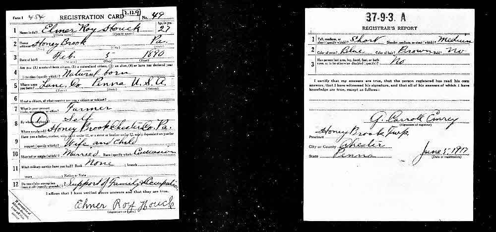 ? He appeared on the census of 6 June 1900 at Earl Township, Lancaster, Pennsylvania.1 He appeared on the census of 21 April 1910 at Salisbury Township, Lancaster, Pennsylvania.7 He was a farmer on 5 June 1917 at Honey Brook, Chester, Pennsylvania.2 He lived on 5 June 1917 at Honey Brook, Chester, Pennsylvania.8 He appeared on the census of 28 January 1920 at Caernarvon Township, Lancaster, Pennsylvania.9 He was a laborer at Iron Works, but lived on a farm. on 28 January 1920 at Caernarvon Township, Lancaster, Pennsylvania.9 He was a laborer on farm on 4 April 1930 at Honey Brook Township, Chester, Pennsylvania.5 He and Ethel Houck appeared on the census of 4 April 1930 at Honey Brook Township, Chester, Pennsylvania.5 Elmer Roy Houck and Ethel Houck lived in April 1935 at Honeybrook, Chester, Pennsylvania. 1940 Census states family lived in same house in 1935.10 Elmer Roy Houck and Ethel Houck appeared on the census of 26 April 1940 at Honeybrook, Chester, Pennsylvania.10 Elmer Roy Houck and Ethel Houck lived on 26 April 1942 at Honey Brook, Chester, Pennsylvania; Draft registration lists John Beiler as Elmer's employer, Honey Brook, PA.3