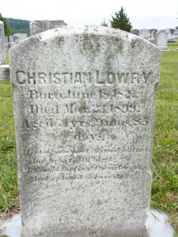 Christian Lowry was born on 18 June 1827.1 He married Leah Fellenbaum before 1850.1 Christian Lowry died on 23 March 1899 at age 71.1 He was buried on 26 March 1899 at Ranck's United Methodist Cemetery, New Holland, Lancaster, Pennsylvania.1