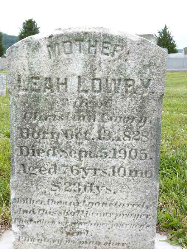 Leah Fellenbaum was born on 13 October 1828.1 She married Christian Lowry before 1850.1 Leah Fellenbaum died on 5 September 1905 at age 76.1 She was buried on 8 September 1905 at Ranck's United Methodist Cemetery, New Holland, Lancaster, Pennsylvania.1 Leah Fellenbaum Find-a-Grave.com ID # 30185204.