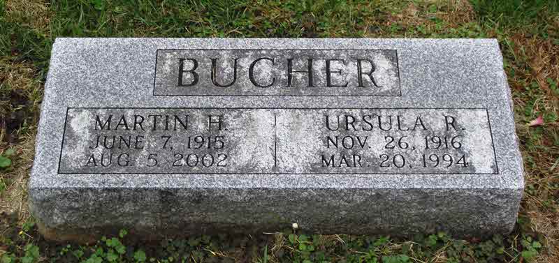 Martin Hostetter Bucher was born on 7 June 1915.1 He married Ursula Ruth Houck, daughter of Christian Walter Houck and Anna Metzler, before 1940.1 Martin Hostetter Bucher died on 5 August 2002 at age 87.1 He was buried on 8 August 2002 at Erb Mennonite Church Cemetery, Lititz, Lancaster, Pennsylvania.1 Martin Hostetter Bucher Find-a-Grave.com ID # 119751558.